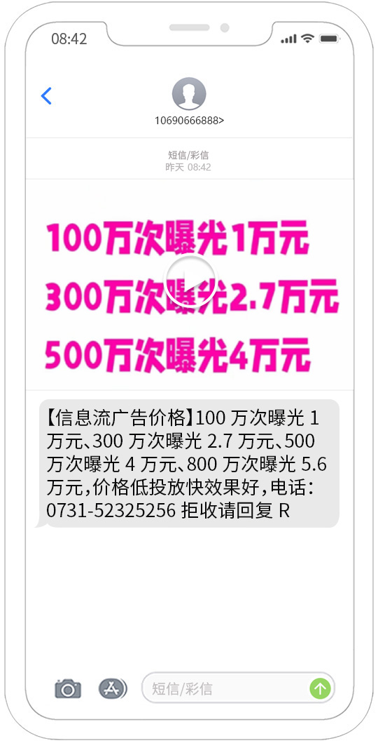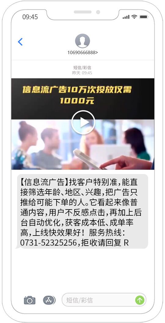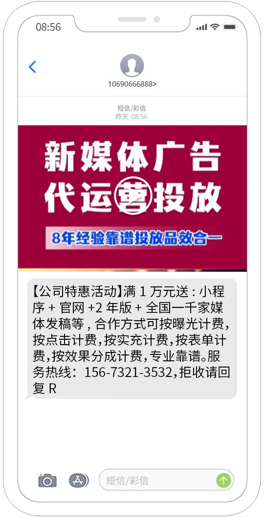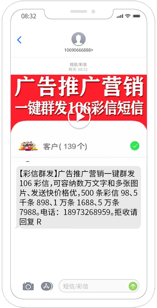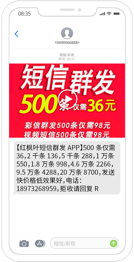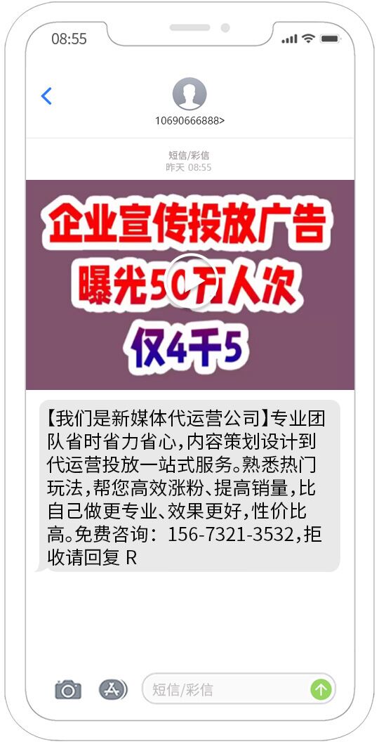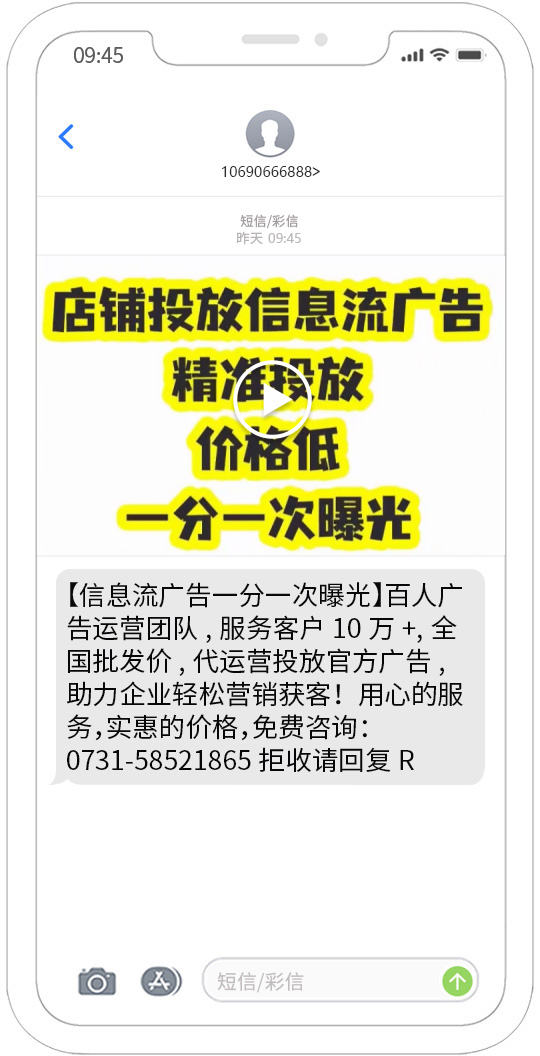 視頻短信發(fā)送能夠覆蓋移動、聯(lián)通、電信用戶,正規(guī)集團(tuán)視頻短信通道,快速、可靠、穩(wěn)定、形象好,能快速將您的訊息投放到用戶的手機(jī)。
